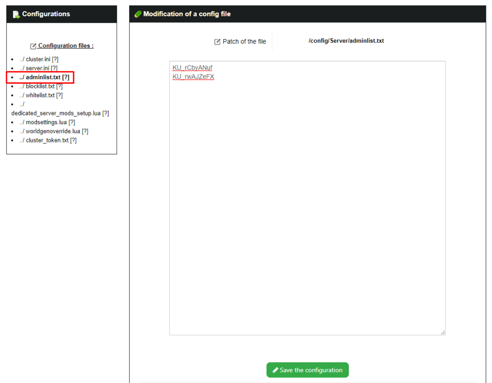 Il n'est pas nécessaire d'effectuer la moindre manipulation pour vous ajouter en tant qu'administrateur si vous êtes le propriétaire du serveur, en effet, le compte qui a créé le token utilisé par le serveur est automatiquement ajouté aux administrateurs sans action supplémentaire. Pour ajouter des administrateurs secondaires, vous devez récupérer les ID utilisateur Klei des joueurs en question. Il existe deux façons de les obtenir, vous pouvez leur demander de cliquer sur "Account" sur la page d'accueil du jeu et l'identifiant sera affiché sur la page qui s'ouvrira : L'autre solution consiste à aller voir le fichier "/dst - verygames/config/Server/Master/server_chat_log.txt" sur votre FTP après que les joueurs en question aient écrit dans le chat, vous y trouverez l'ID des joueurs avant leur nom entre les parenthèses : Une fois que vous avez ces identifiants, rendez-vous dans l'onglet "Configuration" du panel et cliquez sur le fichier "adminlist.txt" dans la liste sur la gauche. Ajouter les identifiants des différents joueurs que vous voulez voir administrateur dans le fichier, un par ligne : Enregistrez le fichier puis redémarrez le serveur, les joueurs sont désormais administrateurs. Vous pouvez savoir si un joueur est administrateur en jeu en regardant la liste des joueurs (TAB), s'il y a une étoile à côté de l'icône de son personnage, le joueur est administrateur : -