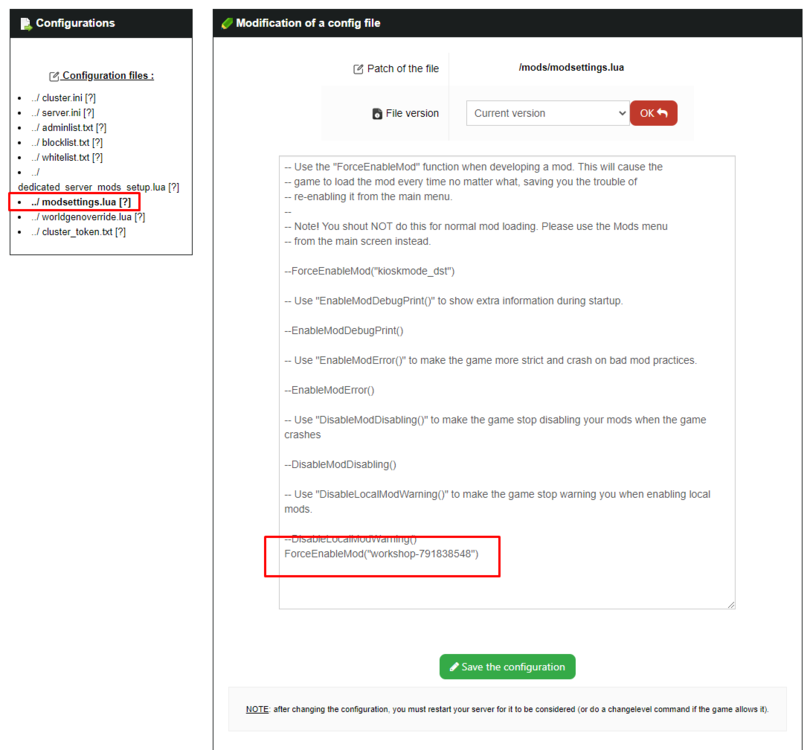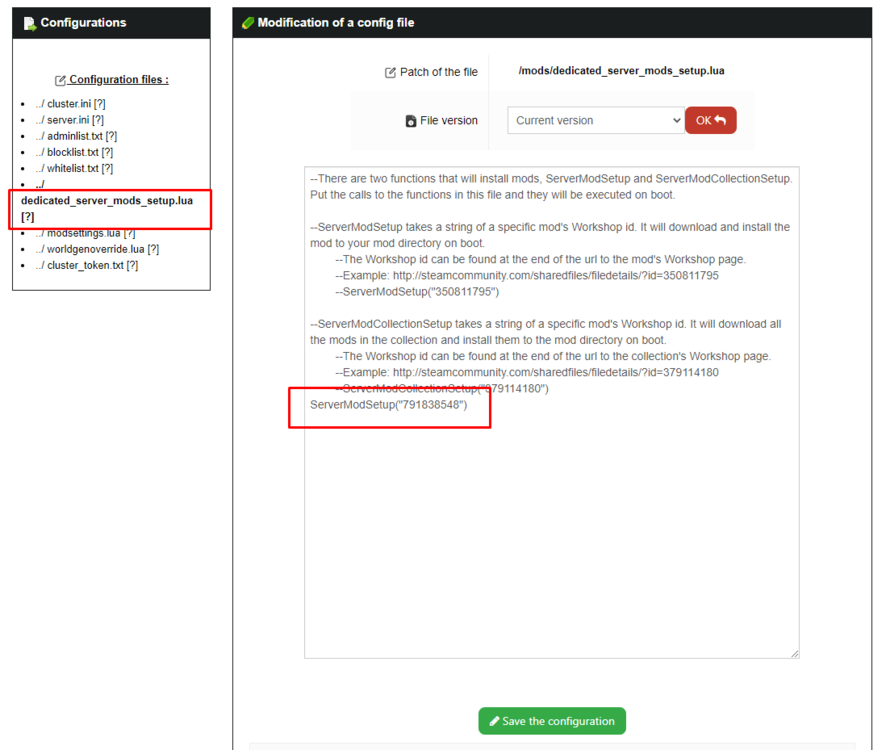 To install a mod on your Don't Starve Together server, you must go to the desired mod page in the workshop and retrieve the URL of the page. We will use the "L'Engineer" mod in this example, whose URL is: https://steamcommunity.com/sharedfiles/filedetails/?id=791838548 To install a mod on your server, you need to retrieve its ID, this corresponds to the number in the URL, in our example the ID is therefore 791838548. Once you have this information, go to the "Configuration" tab of your panel and select the "dedicated_server_mods_setup.lua" file from the list on the left. Create a new line in the file in which you must put : ServerModSetup("id_of_the_mod") So this gives this for our example : Editing this file allows your server to download the mod automatically, once this is done, it must be activated. Still in the "Configuration" tab of the panel, select the "modsettings.lua" file, and add the following line to it : ForceEnableMod("workshop-id_of_the_mod") So you should have something like this : Remember to save the files after editing them and then restart your server. Your mod is now installed and active :