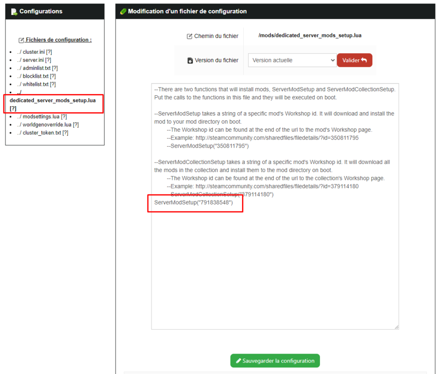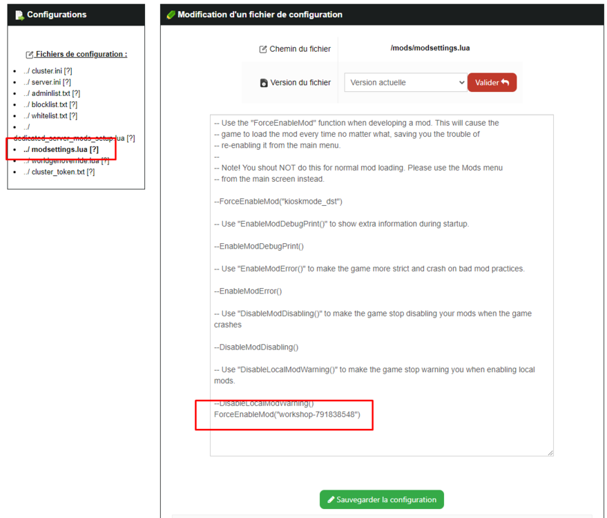 Pour installer un mod sur votre serveur Don't Starve Together, vous devez vous rendre sur la page du mod désiré dans le workshop et récupérer l'URL de la page. Nous allons utiliser le mod "L'Engineer" dans cet exemple, dont l'URL est : https://steamcommunity.com/sharedfiles/filedetails/?id=791838548 Pour installer un mod sur votre serveur, vous devez récupérer son ID, cela correspond au nombre qui se trouve dans l'URL, dans notre exemple l'ID est donc 791838548. Une fois que vous avez cette information, rendez-vous dans l'onglet "Configuration" de votre panel et sélectionnez le fichier "dedicated_server_mods_setup.lua" dans la liste sur la gauche. Créez une nouvelle ligne dans le fichier dans laquelle vous devez mettre : ServerModSetup("id_du_mod") Cela donne donc ceci pour notre exemple : La modification de ce fichier permet de faire télécharger automatiquement le mod à votre serveur, une fois que cela est fait, il faut l'activer. Toujours dans l'onglet "Configuration" du panel, sélectionnez le fichier "modsettings.lua", et ajoutez-y la ligne suivante : ForceEnableMod("workshop-id_du_mod") Vous devez donc avoir quelque chose comme ceci : N'oubliez pas de sauvegarder les fichiers après les avoir édité puis redémarrez votre serveur. Votre mod est désormais installé et actif :
