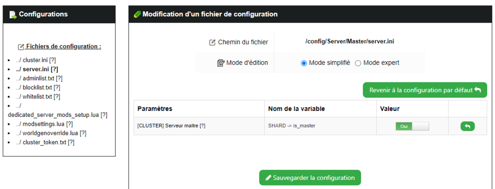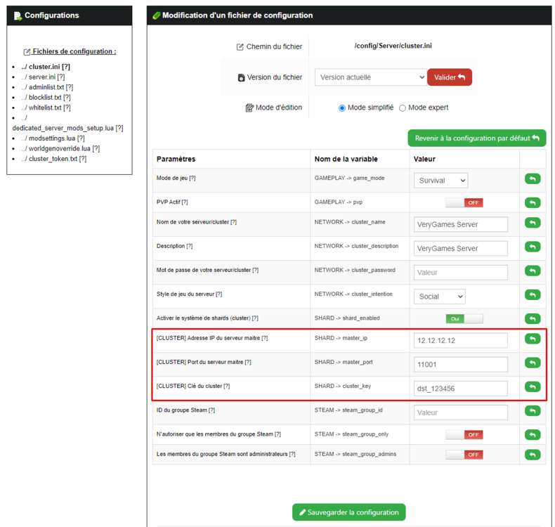 Il est possible de lier plusieurs serveurs Don't Starve Together et de passer de l'un à l'autre via les portails en jeu. Pour cela, vous devez posséder au moins deux serveurs, un des serveurs sera le serveur maître (principal), celui auquel tous les autres serveurs seront directement liés. Avant de continuer, il est nécessaire de préparer un quelques informations : L'adresse IP du serveur maître (dans l'exemple : 12.12.12.12) Le port utilisé pour communiquer avec le serveur maître (port du serveur +1 [ou 11001 si vous avez une IP dédiée] chez VeryGames) Un "mot de passe" qui sera utilisé par les serveurs pour communiquer entre eux, ne communiquez pas ce mot de passe aux joueurs, vous pouvez choisir ce que vous voulez (dans l'exemple : dst_123456, il est conseillé d'utiliser un mot de passe fort, qui sera difficile à trouver) Commencez par vous rendre dans l'onglet "Configuration" de votre panel pour votre serveur maître et sélectionnez le fichier "cluster.ini". Vous devez modifier les paramètres dont le nom commence par "[CLUSTER]" afin d'y renseigner les informations que vous avez préparées. Vos serveurs étant liés après cette opération, seul le serveur maître sera directement accessible, c'est donc également ici que vous pouvez définir le nom, la description, le style et le mot de passe de votre cluster. Une fois ce fichier édité et sauvegardé, modifiez le fichier "server.ini", si vous configurez le serveur maître, activez l'option "is_master" et désactivez-la sur les serveurs "enfants" (attention, le serveur doit être éteint lorsque vous modifiez ce fichier). Sauvegardez, le fichier puis redémarrez le serveur. Vous pouvez ensuite effectuer les mêmes opérations sur vos autres serveurs. Pour vous assurer que l'opération a bien fonctionné, vous pouvez regarder la console de votre serveur maître (dans l'onglet "Console en direct), vous devriez pouvoir y voir ces messages après le démarrage d'un serveur enfant (dont l'IP est 23.23.23.23 dans cet exemple) : Vous pouvez retrouver des explications détaillées (en anglais) sur ce système ici. -