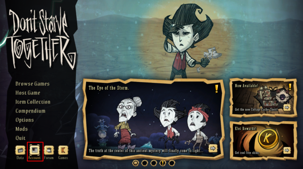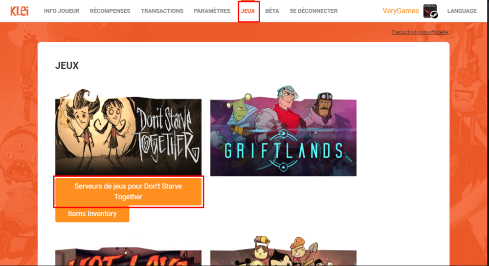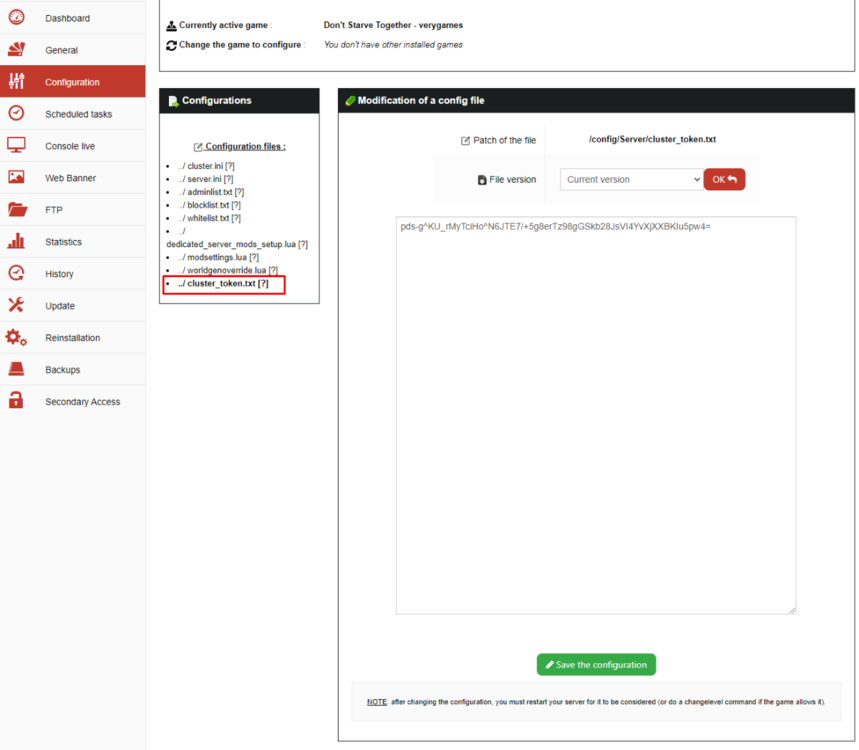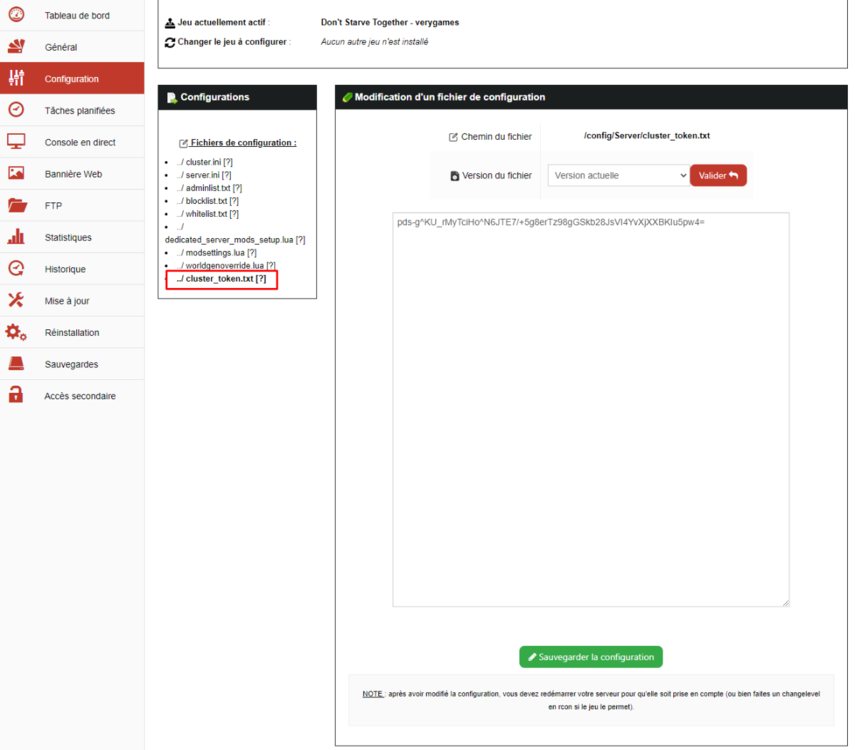 Afin de pouvoir démarrer, tous les serveurs Don't Starve Together doivent utiliser un token. Pour le générer rendez-vous sur le jeu et cliquez sur le bouton "Account" en bas à gauche : Une page web s'ouvrira dans le navigateur de Steam, cliquez sur "Jeux" dans le menu en haut puis sur "Serveurs de jeux pour Don't Starve Together" : Vous arriverez sur une page avec un formulaire, en bas, renseignez le nom de votre cluster (cela vous permet uniquement d'identifier quels serveurs sont liés au token, vous pouvez utiliser la valeur de votre choix) et cliquez sur le bouton "Ajouter un nouveau serveur". Vous pourrez ensuite retrouver votre token dans un bloc tel que celui-ci : Copiez la chaîne de caractères ("pds-g....") et allez sur votre panel VeryGames, dans l'onglet "Configuration". Cliquez sur le fichier "cluster_token.txt" dans la liste sur la gauche puis collez le token dans le fichier et enregistrez-le : Il ne vous restera plus qu'à redémarrer le serveur !