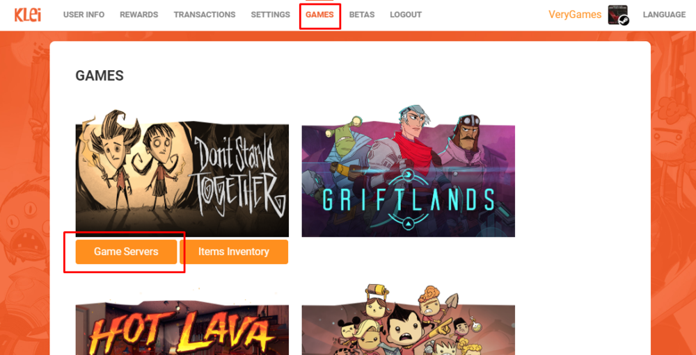 In order to start, all Don't Starve Together servers must use a token. To generate it, go to the game and click on the "Account" button at the bottom left : A web page will open in the Steam browser, click on "Games" in the menu at the top then on "Game servers" : You will arrive on a page with a form, at the bottom, fill in the name of your cluster (this only allows you to identify which servers are linked to the token, you can use the value of your choice) and click on the button "Add a new server". You can then find your token in a block such as this one : Copy the character string ("pds-g ....") and go to your VeryGames panel, in the "Configuration" tab. Click on the "cluster_token.txt" file in the list on the left then paste the token into the file and save it : After a restart, your server will be accessible !
