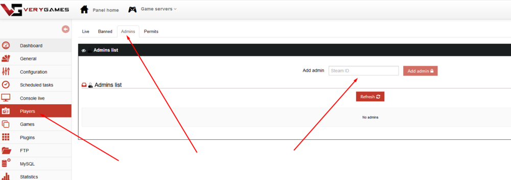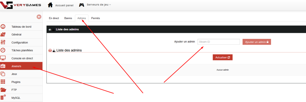 Pour devenir admin de votre serveur rendez-vous dans l'onglet Joueurs depuis votre panel et ensuite l'onglet admin, il sera alors possible de rentrer votre Steam ID