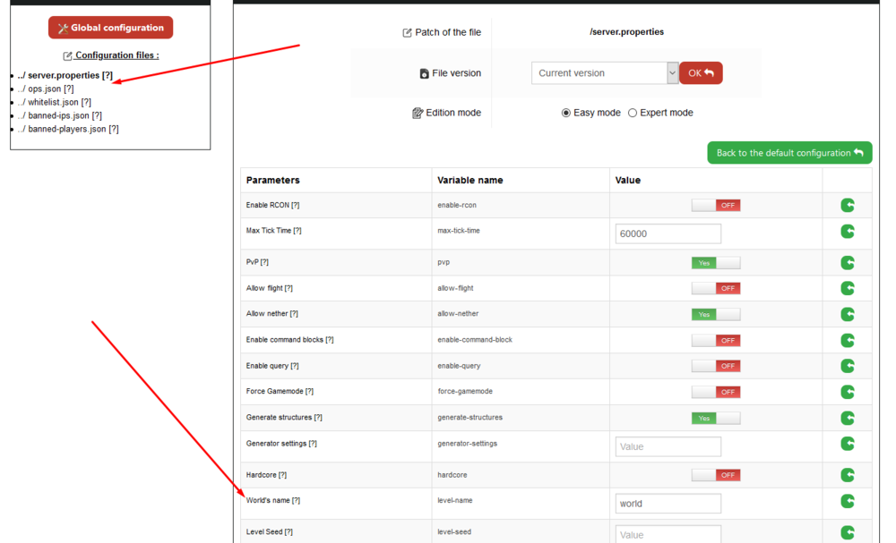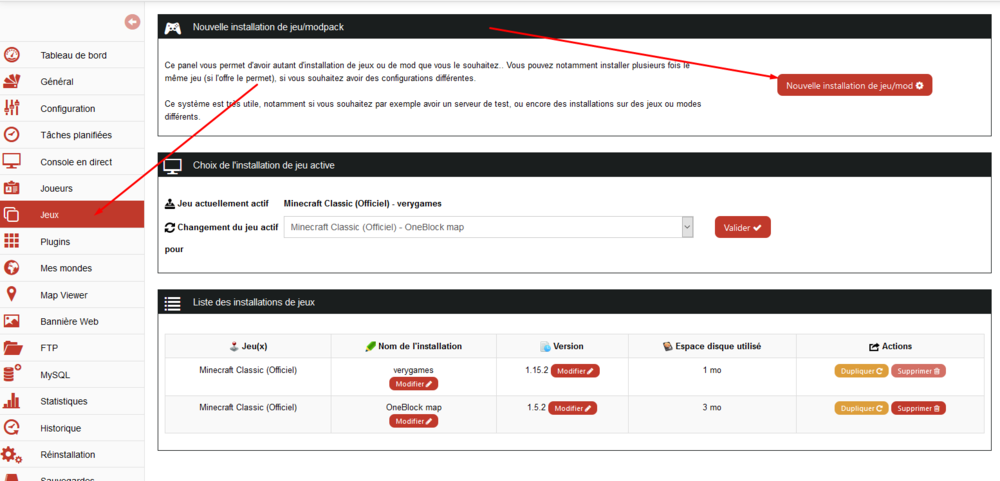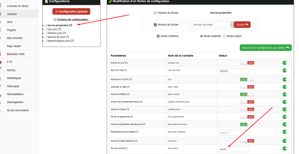 Installez le même Modpack et la même version de Minecraft sur le serveur : Utilisez d'abord le programme d'installation "Nouvelle installation" sur votre panneau pour installer la même version de Minecraft, et le même modpack, sur lequel le monde a été créé. Le téléchargement du dossier du monde créé sur une version différente de Minecraft, ou un autre modpack, peut entraîner des problèmes de chargement du monde. Trouvez le dossier "World" sur votre jeu existant: Accédez à l'emplacement d'installation de votre jeu Minecraft sur votre ordinateur et ouvrez le dossier du jeu. MInecraft nomme votre monde par défaut en "World", sauf si vous avez changé le nom en quelque chose d'autre lorsque vous l'avez créé. Recherchez donc un dossier appelé "World". Si vous ouvrez le dossier, vous devriez voir quelque chose de proche de la vue ci-dessous. Cette liste ci-dessus provient d'un monde créé avec un Modpack spécifique (dans cet exemple, le modpack Stoneblock), donc les fichiers et les noms exacts peuvent être légèrement différents. Certains fichiers seront communs à tous les modpacks, tels que level.dat et les dossiers DIM1 et DIM-1, il ne s'agit donc que d'un exemple pour vous aider à vérifier que vous recherchez le bon dossier. Supprimez tous les dossiers "World" déjà présents sur votre serveur: Si vous avez déjà démarré le serveur, Minecraft aura automatiquement généré un nouveau monde, dans son propre dossier "world". Afin d'éviter toute confusion, vous devez sélectionner ce dossier world et le supprimer à l'aide du bouton en haut de la vue Gestionnaire de fichiers ou via votre FTP, avant de télécharger le vôtre. Nous vous recommandons également d'arrêter votre serveur avant de le faire. Téléchargez les fichiers sur votre serveur: Utiliser un programme FTP : Nous vous recommandons d'utiliser un client FTP pour gérer le téléchargement de fichiers. FTP signifie «File Transfer Protocol». C'est un moyen standardisé de se connecter à un ordinateur distant, puis de gérer le processus de téléchargement de fichiers volumineux. Les programmes FTP divisent le fichier en parties plus petites, les envoient un par un et gardent une trace des parties qui ont été reçues correctement à l'autre extrémité. Il a également l'avantage d'être beaucoup plus rapide dans la plupart des cas. Nous avons un guide de base pour l'utilisation FTP dans notre base de connaissances que vous pouvez affiner dans votre onglet FTP sur votre panel. Nous recommandons fortement Filezilla pour cela. Si cela est fait avec succès, vous aurez le même dossier de votre ordinateur sur le serveur. Modifiez les paramètres pour utiliser le dossier: Minecraft nomme automatiquement tous les mondes qu'il crée "world", si le vôtre a été nommé ainsi, il recherchera et utilisera automatiquement ce dossier au démarrage. Si votre monde est nommé autrement, vous devrez modifier les paramètres qui indiquent à Minecraft à partir de quel dossier charger les informations du monde. Cliquez sur configuration dans le panneau de configuration, puis cliquez sur server.properties et remplacez le mot "world" par le nom exact de votre propre dossier world. Toutes nos félicitations! Votre monde a été téléchargé sur votre serveur! Si tout a été fait correctement, le serveur devrait charger votre monde lors de son prochain démarrage. Connectez-vous au jeu pour vous assurer que tout va bien, et si c'est le cas, vous êtes prêt à continuer à explorer votre propre monde personnalisé.
