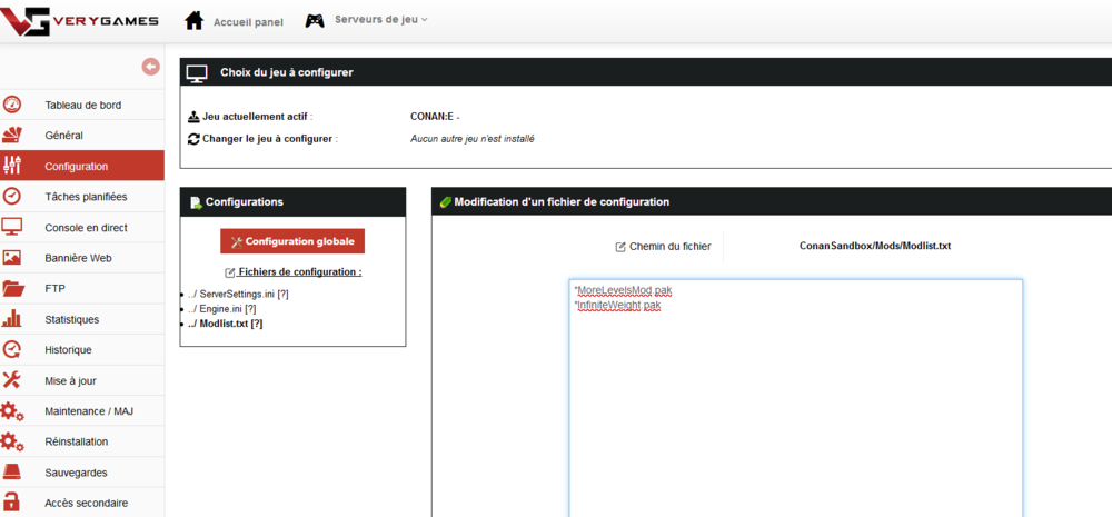 La compatibilité de Mod dépend de la nature des modifications de code effectuées dans les correctifs. Les joueurs et les serveurs qui utilisent des mods peuvent rencontrer des problèmes de compatibilité lorsqu'ils tentent de jouer immédiatement après un nouveau patch. N'oubliez donc pas de vérifier la version des mods que vous utilisez. Comme les développeurs ne peuvent pas garantir qu'ils seront compatibles avec une nouvelle version du jeu, ils vous recommandent de désactiver les mods lorsque vous rencontrez un problème après la sortie d'un correctif. De cette façon, vous pouvez confirmer qu'un problème est causé par un mod incompatible ou s'il s'agit d'un bogue à corriger. 1) Aller sur le workshop et s'abonner aux mods 2) Panel de gestion du serveur Créer un accès FTP si ce n'est pas encore fait. Y accéder ensuite pour faire les modifications nécessaires. 3) Créer un nouveau dossier "Mods" dans /games/conan_exiles/ConanSandBox 4) Modifications Rendez-vous dans l'onglet configuration sur votre panel et ajouter le nom des fichiers .pak de la façon suivante : Enregistrer et fermer 5) Uploader les mods Il faut maintenant uploader les mods sur le serveur. Vous pourrez trouver les mods de Conan Exiles auxquels vous êtes abonnés dans ce répertoire sur votre ordinateur : Uploder ensuite chaque fichier .pak se trouvant dans chaque dossier Vous obtenez alors : 6) Redémarrer le serveur