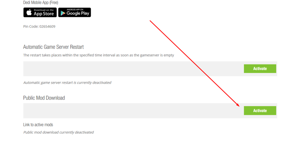 To create a download link for your list of mods on your server, you first have to go to your FS panel. Then in the "Settings" tab available on the top of your panel. At the bottom of this page, look for Public Mod Download and click on the "Activate" button to display your link.